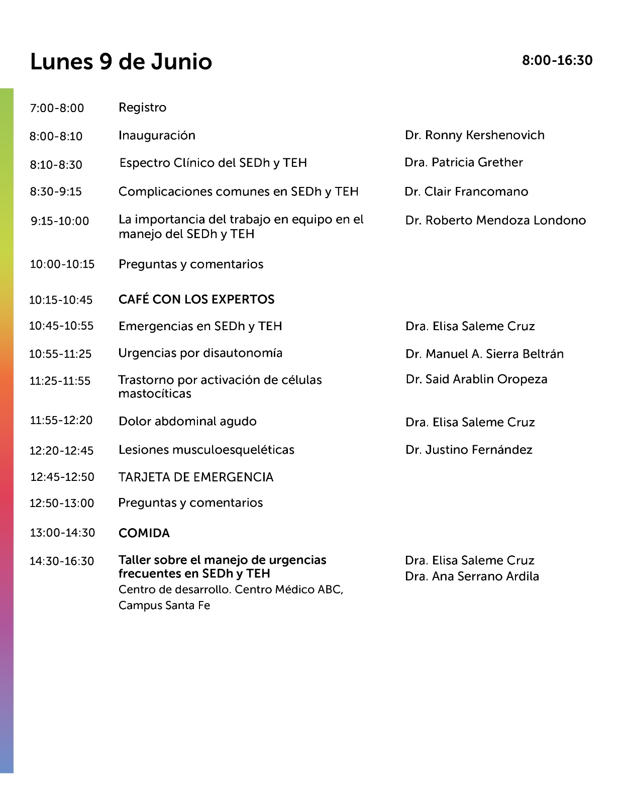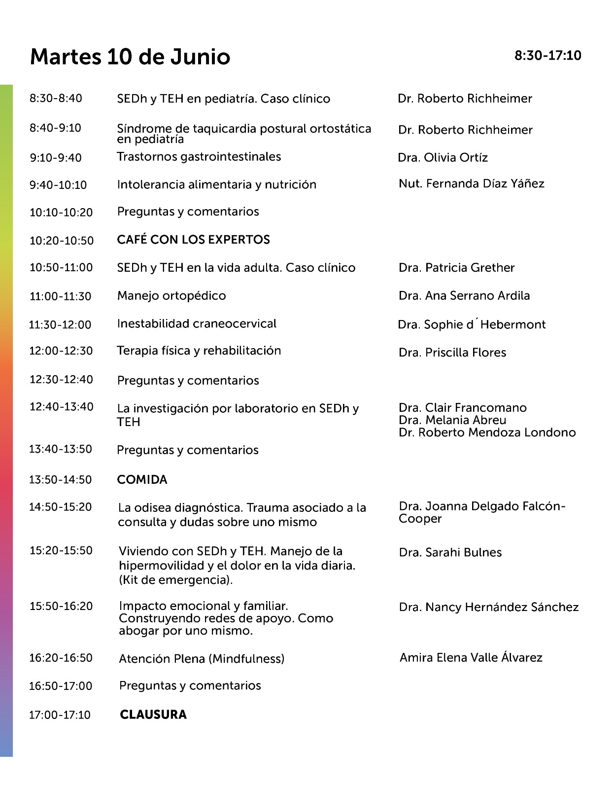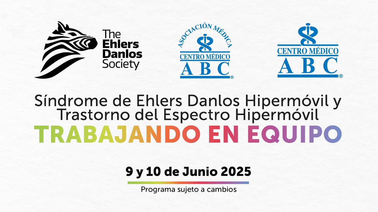 El centro médico ABC en colaboración con The Ehlers Danlos Society se complace en darle la bienvenidoa al evento "Sindrome de Ehlers-Danlos Hipermóvil (SEDh) y Trastorno del Espectro Hipermóvil (THS): Trabajando en Equipo", que se llevará a cabo los días 9 y 10 de junio de 2025. El evento se impartirá principalmente en español y contará con traducción en tiempo real a más de 60 idiomas.